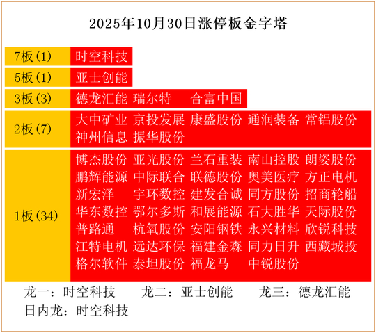 2025年10月30日涨停板连板:时空科技7连板 亚士创能5板