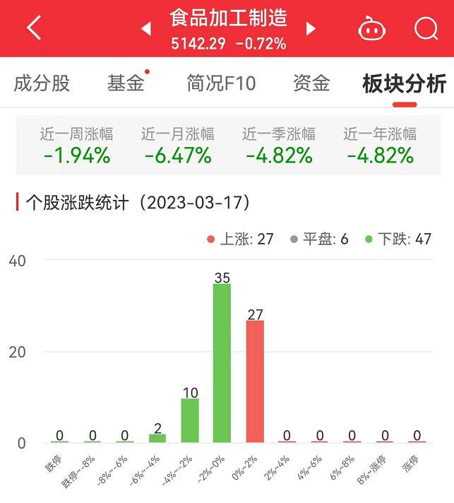 中国经济网北京3月17日讯 今日,食品加工制造板块整体跌幅0.72%,其中,27只股票上涨,6只股票平盘,47只股票下跌。