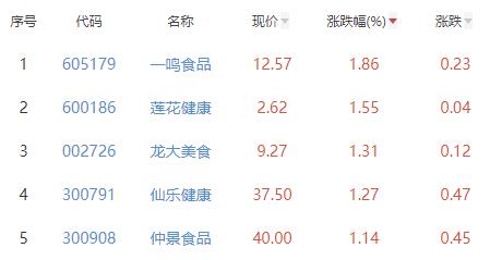 其中,一鸣食品、莲花健康、龙大美食、仙乐健康、仲景食品位列板块涨幅前五位,涨幅分别为1.86%、1.55%、1.31%、1.27%、1.14%。
