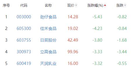 劲仔食品、佳禾食品、日辰股份、立高食品、天润乳业位列涨幅榜后五位,涨幅分别为-5.43%、-4.23%、-3.80%、-3.33%、-3.32%。