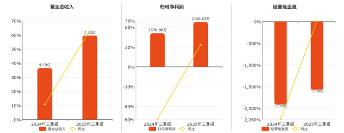 公司营业总收入为7.32亿元。归母净利润为2108.63万元。经营活动现金净流入为-1.30亿元。