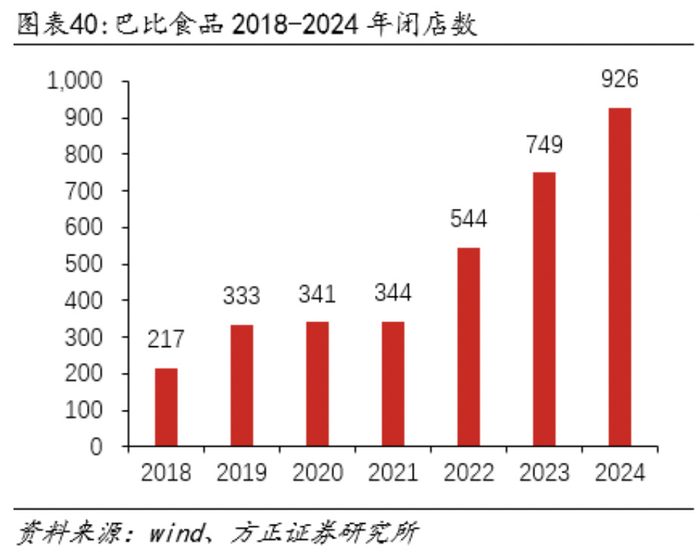 从2021年起,巴比食品的扩店速度明显有加快,尤其2022-2023这两年,2024如果不是闭店数太多,新开门店数也是相当可观的。仔细看下图,其实自2022起,公司的闭店数相比此前就明显上了一个台阶。