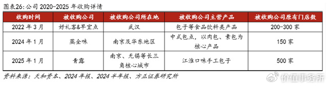 2022年3月,公司进行了第一次并购,收购的武汉好礼客&早宜点而后整合良好,因此,2024、2025又进行了三次并购。第一次收购是在武汉这种巴比布局比较薄弱的地区,后三次并购的蒸全味、青露则直接位于巴比布局强势的江浙地区(PS:下表不全,今年7月公司还完成了浙江知名包点连锁“馒乡人”旗下约 250 家门店供应链切换)。
