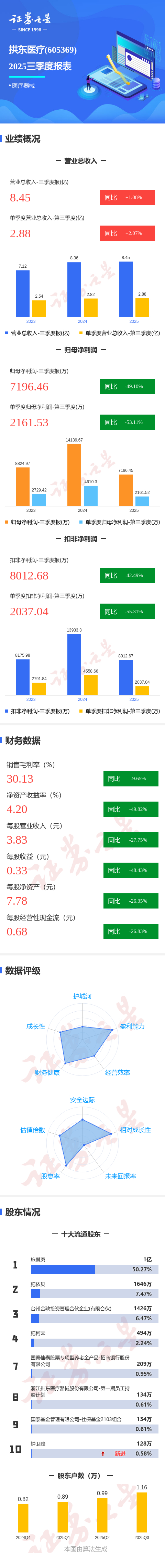 证券之星消息,拱东医疗2025年三季报显示,前三季度公司主营收入8.45亿元,同比上升1.08%;归母净利润7196.46万元,同比下降49.1%;扣非净利润8012.68万元,同比下降42.49%;其中2025年第三季度,公司单季度主营收入2.88亿元,同比上升2.07%;单季度归母净利润2161.53万元,同比下降53.12%;单季度扣非净利润2037.04万元,同比下降55.31%;负债率18.49%,投资收益-805.77万元,财务费用-315.98万元,毛利率30.13%。