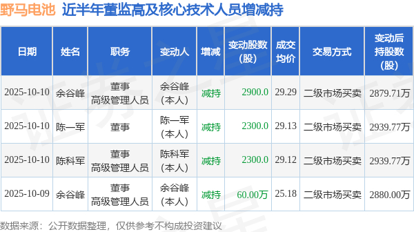 证券之星消息,根据10月14日市场公开信息、上市公司公告及交易所披露数据整理,野马电池(605378)最新董监高及相关人员股份变动情况:2025年10月10日公司董事陈一军、董事,高级管理人员余谷峰、董事,高级管理人员陈科军共减持公司股份7500.0股,占公司总股本为0.0029%。变动期间公司股价下跌1.82%,10月10日当日收盘报28.06元。