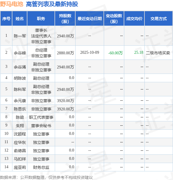 野马电池:10月10日高管陈一军、余谷峰、陈科军减持股份合计7500股