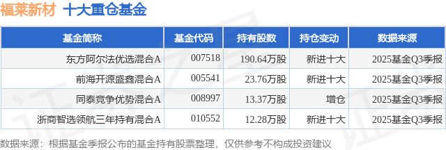 根据2025基金Q3季报公募基金重仓股数据,重仓该股的公募基金共4家,其中持有数量最多的公募基金为东方阿尔法基金的东方阿尔法优选混合A。东方阿尔法优选混合A目前规模为1.28亿元,最新净值1.0963(12月10日),较上一交易日上涨1.1%,近一年上涨51.46%。该公募基金现任基金经理为周谧。周谧在任的基金产品包括:东方阿尔法科技优选混合发起A,管理时间为2025年6月12日至今,期间收益率为-2.17%;东方阿尔法产业先锋混合A,管理时间为2025年7月1日至今,期间收益率为40.09%;东方阿尔法优势产业混合A,管理时间为2025年11月5日至今,期间收益率为11.67%。
