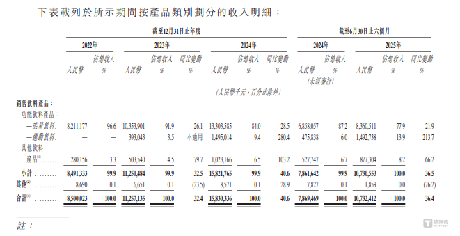 从产品上看,东鹏饮料主要拥有能量饮料、运动饮料、其他饮品产品,其中2022年-2024年和2025年1-6月(下称“报告期”)能量饮料产生的销售收入分别为82.21亿元、103.54亿元、133.03亿元、83.61亿元,分别占当期营业收入的96.6%、91.9%、84%、77.9%,每年至少有7成的收入是来自能量饮料,产品结构呈现出高度单一化的特征。