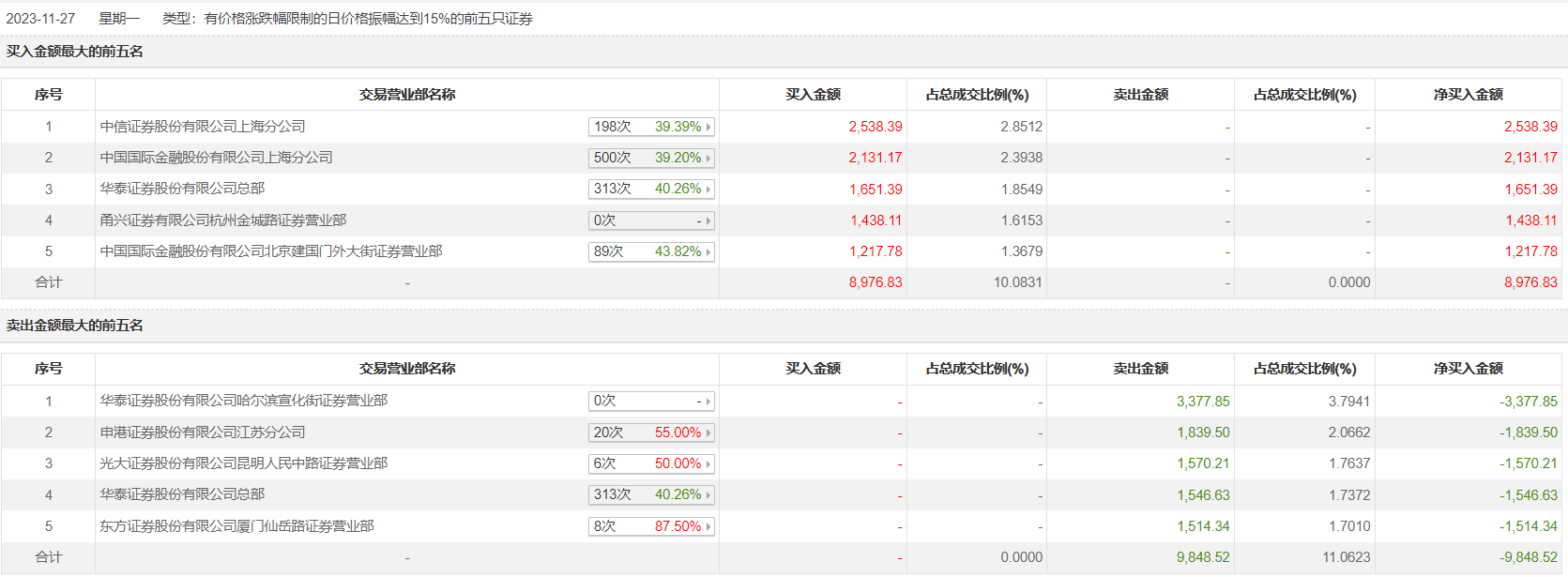 龙版传媒11月27日跌停,全天换手率达23.62%,振幅达19.45%。龙虎榜数据显示,营业部席位合计净卖出871.69万元。其中,华泰证券哈尔滨宣化街证券营业部、申港证券江苏分公司分别卖出3377.85万元、1839.50万元;中信证券上海分公司、中国国际金融上海分公司分别买入2538.39万元、2131.17万元。