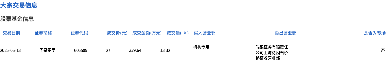 圣泉集团今日大宗交易平价成交13.32万股,成交额359.64万元
