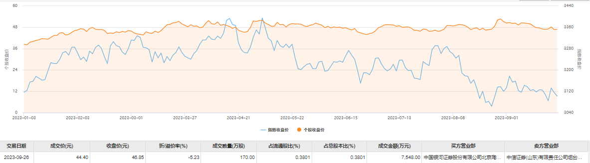 9月26日大宗交易成交170万股,成交额7548万元,占当日总成交额的40.01%,成交价44.4元,较市场收盘价46.85元折价5.23%。