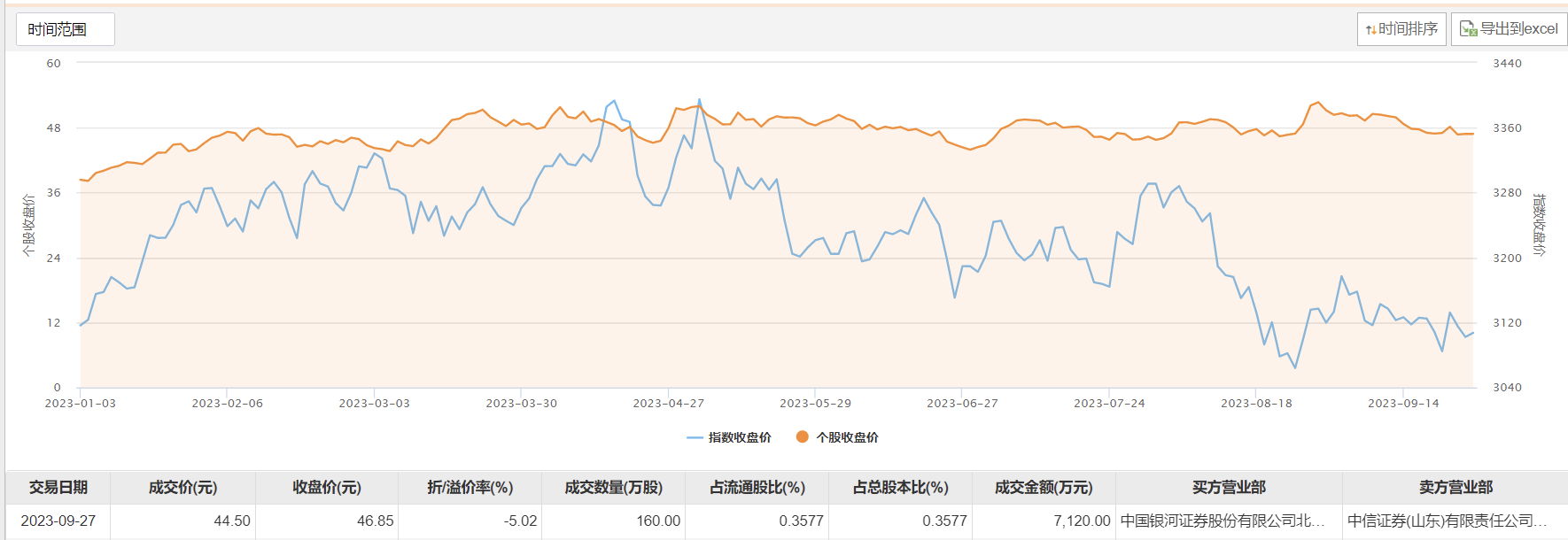今日大宗交易成交160万股,成交额7120万元,占当日总成交额的40.76%,成交价44.5元,较市场收盘价折价5.02%。