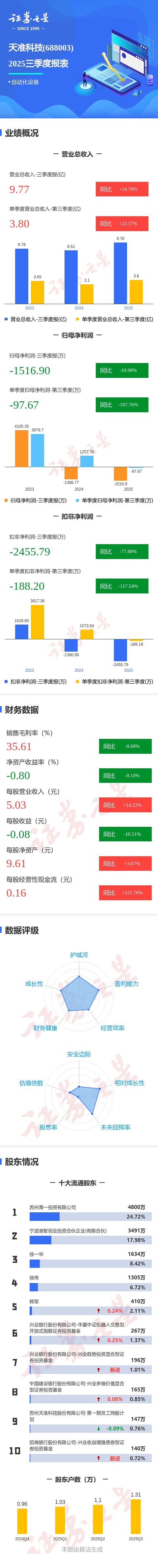 图解天准科技三季报:第三季度单季净利润同比下降107.77%