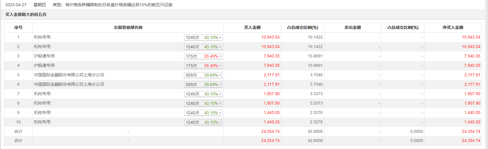 4月27日,杭可科技今日涨15.55%,龙虎榜数据显示,上榜营业部席位全天成交3.51亿元,占当日总成交金额比例为61.37%。其中,买入金额为2.44亿元,卖出金额为1.07亿元,合计净买入1.36亿元。