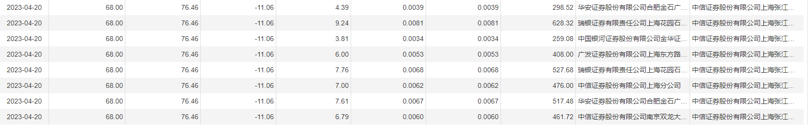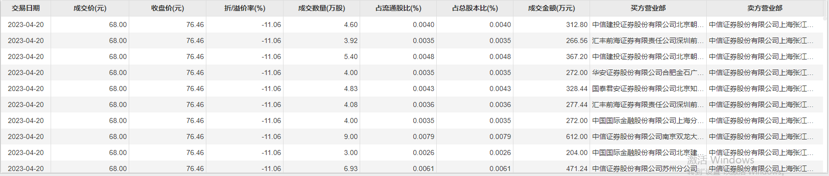 4月20日大宗交易成交102.36万股,成交额6960.48万元,占当日总成交额的2.69%,成交价68元,较市场收盘价76.46元折价11.06%。