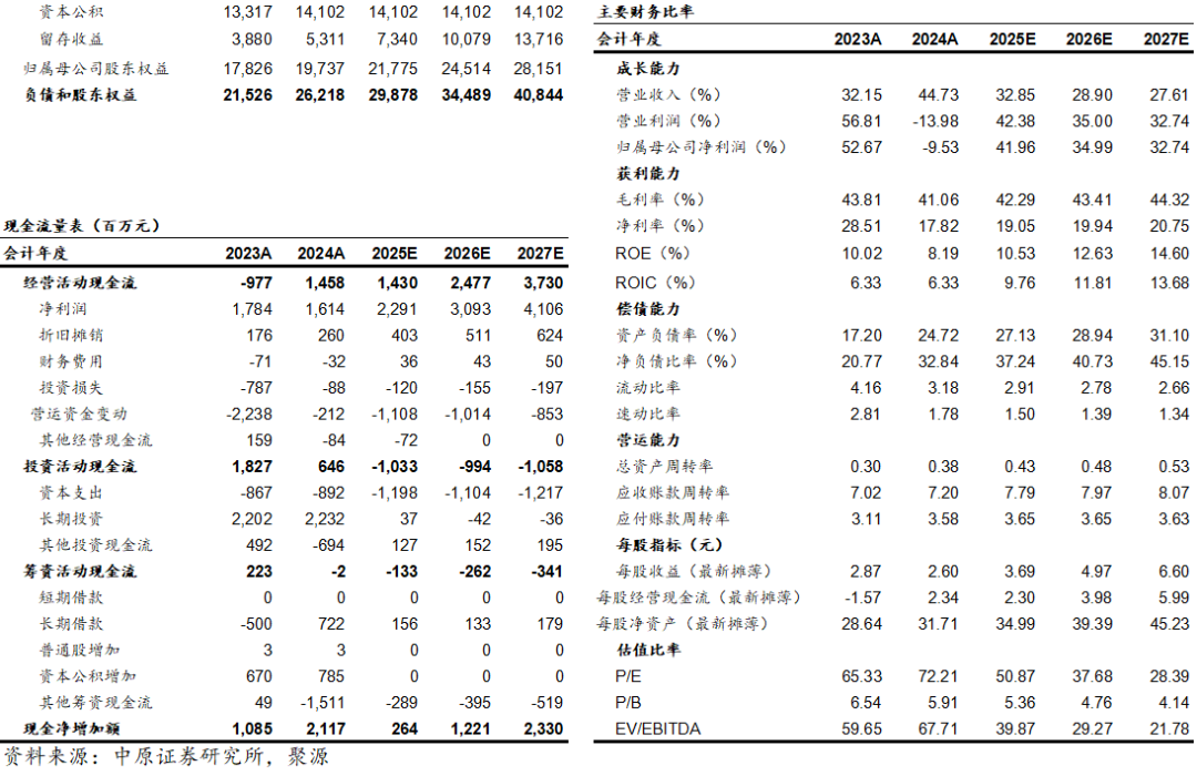 营收持续高速成长,合同负债与存货大幅增长。公司的等离子体刻蚀设备在国内外持续获得更多客户的认可,针对先进逻辑和存储器件制造中关键刻蚀工艺的高端产品新增付运量显著提升,公司的薄膜设备已经顺利进入市场,并开始贡献收入,推动公司整体营收持续高速成长。公司2024年实现毛利率为41.06%,同比下降4.77%,25Q1毛利率为41.54%,同比下降3.40%,环比提升2.28%;公司2024年实现净利率为17.81%,同比下降10.67%,25Q1净利率为14.18%,同比下降1.32%,环比下降5.55%。由于市场对公司开发多种新设备的需求急剧增长,公司持续加大研发力度,2024 年研发投入约24.52亿元,同比增长约94.31%,研发投入占营业收入比例约为27.05%;25Q1公司研发投入约6.87亿元,同比增长约90.53%。25Q1末公司合同负债为30.67亿元,较24Q1末大幅增长162.36%,较24年底增长18.60%;25Q1末公司存货为74.48亿元,较24Q1末增长33.38%,较24年底增长5.81%;公司合同负债与存货大幅增长,为后续营收持续高速成长奠定坚实基础。