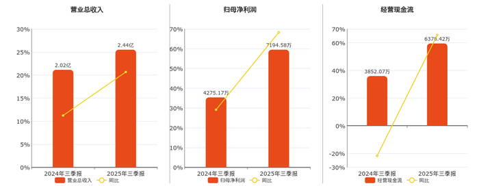 公司营业总收入为2.44亿元。归母净利润为7194.58万元。经营活动现金净流入为6378.42万元。