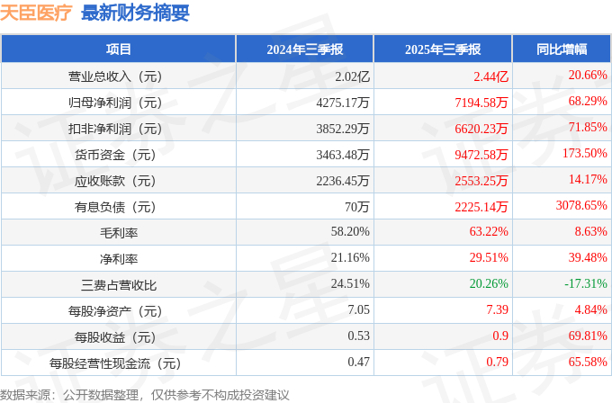 据证券之星公开数据整理,近期天臣医疗(688013)发布2025年三季报。截至本报告期末,公司营业总收入2.44亿元,同比上升20.66%,归母净利润7194.58万元,同比上升68.29%。按单季度数据看,第三季度营业总收入8766.31万元,同比上升26.4%,第三季度归母净利润2373.42万元,同比上升70.74%。本报告期天臣医疗盈利能力上升,毛利率同比增幅8.63%,净利率同比增幅39.48%。
