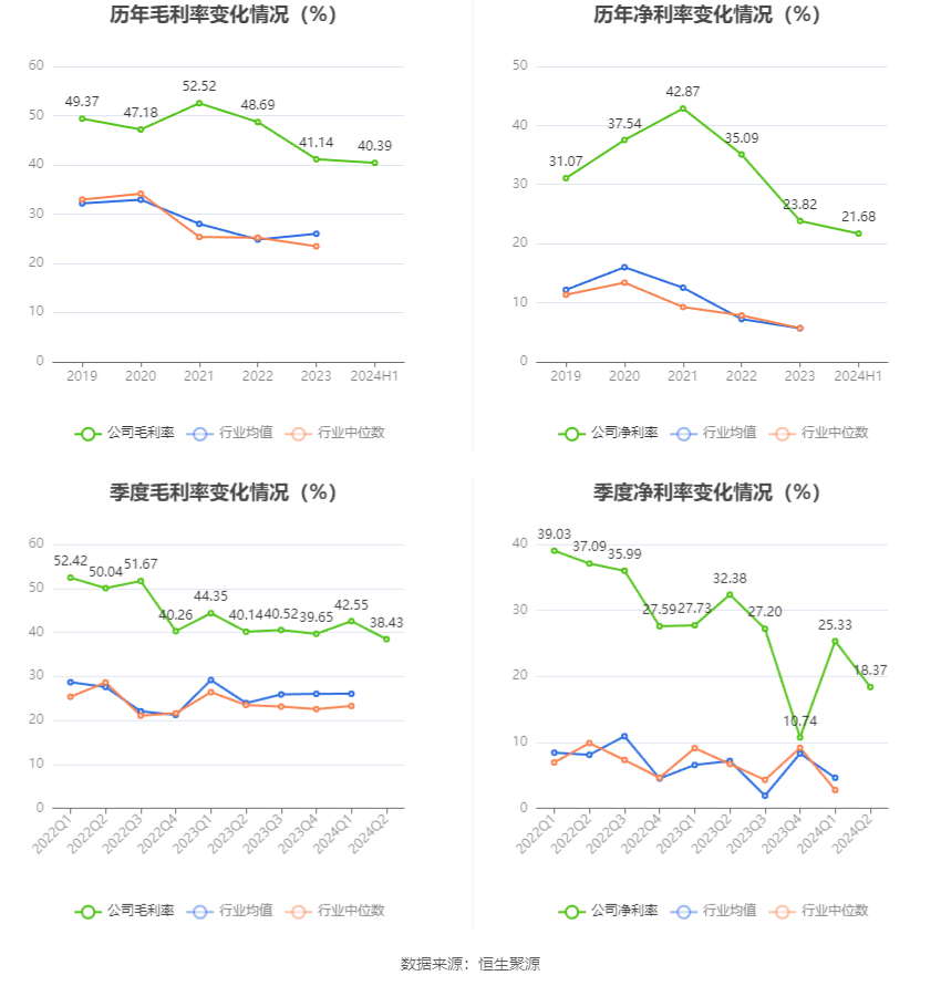 2024年上半年,公司毛利率为40.39%,同比下降1.92个百分点;净利率为21.68%,较上年同期下降8.30个百分点。从单季度指标来看,2024年第二季度公司毛利率为38.43%,同比下降1.71个百分点,环比下降4.12个百分点;净利率为18.37%,较上年同期下降14.01个百分点,较上一季度下降6.96个百分点。