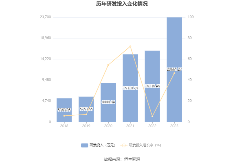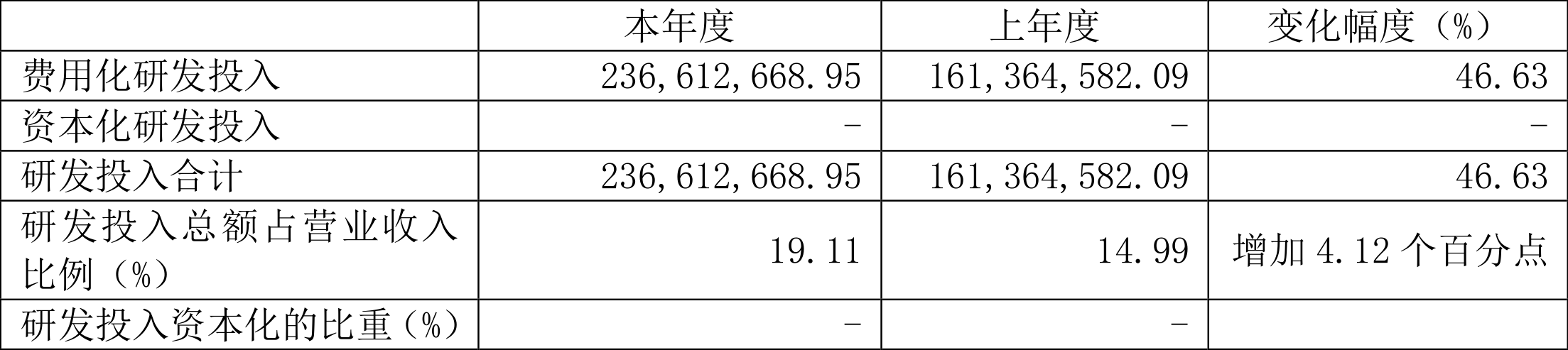 2023年全年,公司研发投入金额为2.37亿元,同比增长46.63%;研发投入占营业收入比例为19.11%,相比上年同期上升4.12个百分点。