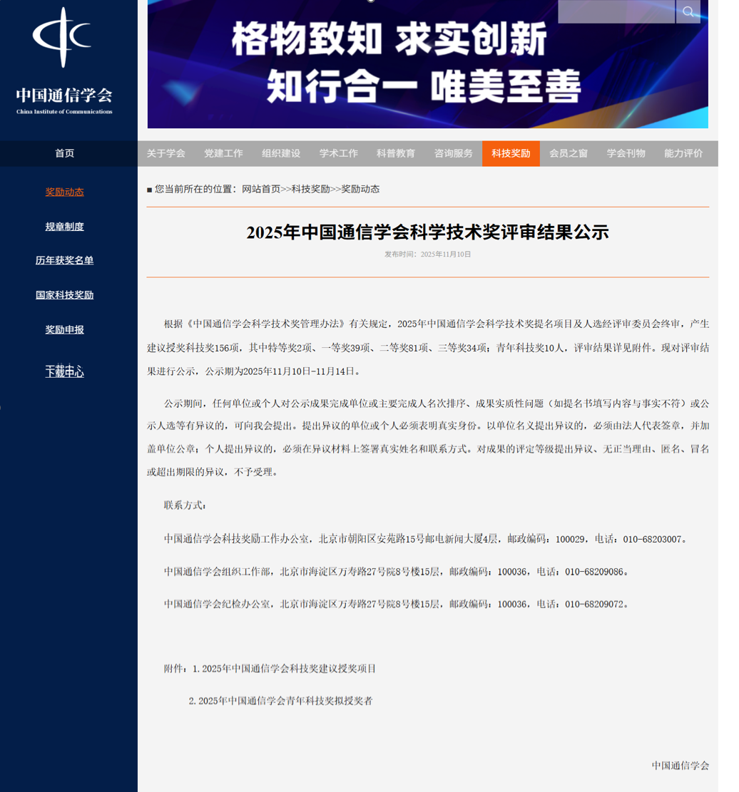 中国通信学会科学技术奖旨在表彰通信与信息技术领域的重大科技成果与杰出贡献。本次评审历经严格筛选与终审,共产生156项建议授奖科技奖,其中二等奖81项。
