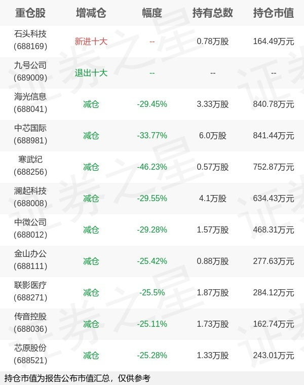 证券之星消息,10月28日华夏基金旗下荣膺管理的华夏上证科创板50成份交易型开放式指数基金发起式联接基金公布三季报,近1年净值增长率45.56%。与上一季度相比,该基金前十大重仓股新增石头科技;其中海光信息持仓占比0.08%,为该基金第一大重仓股;九号公司等退出前十大重仓股;详细数据如下: