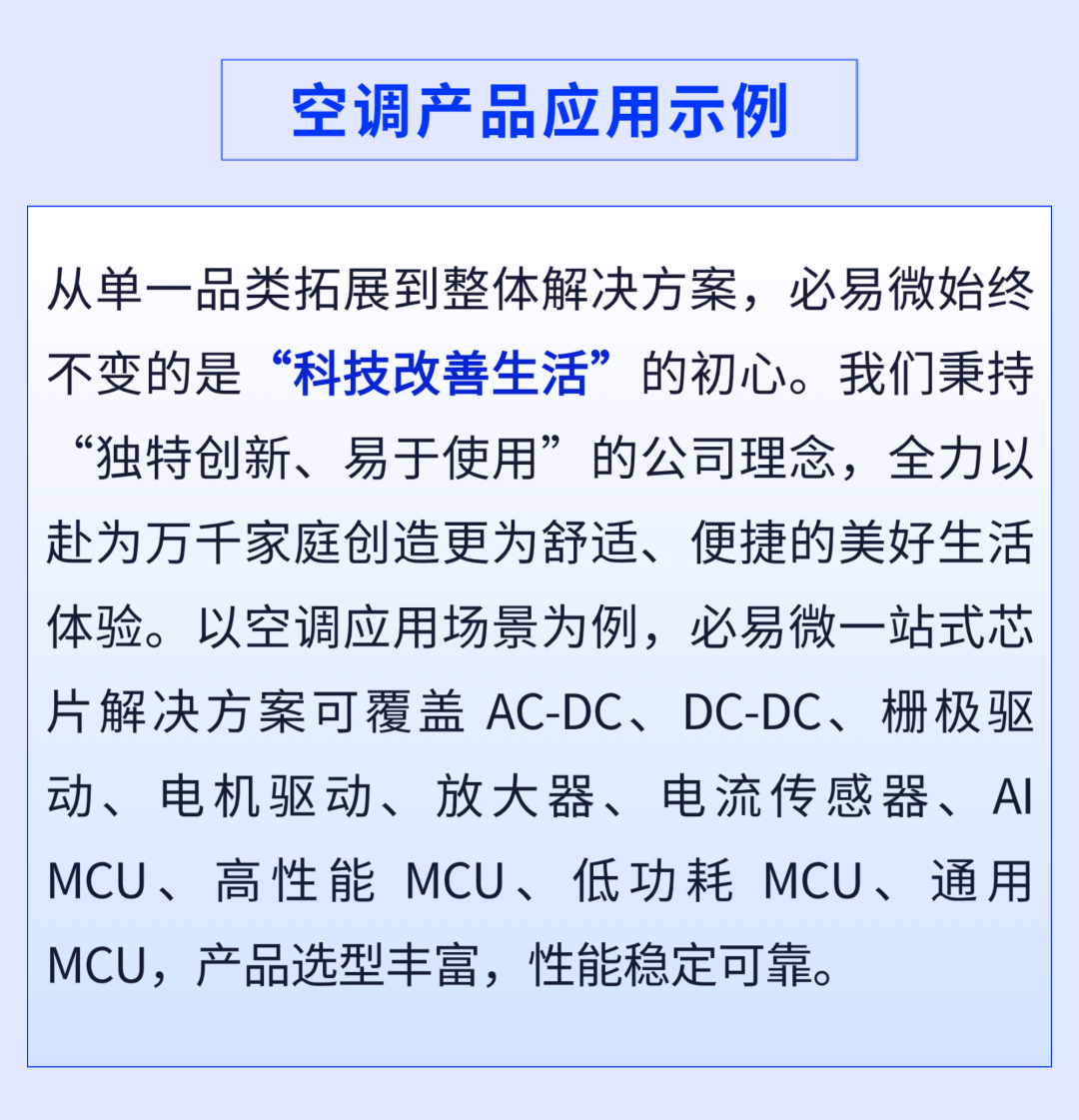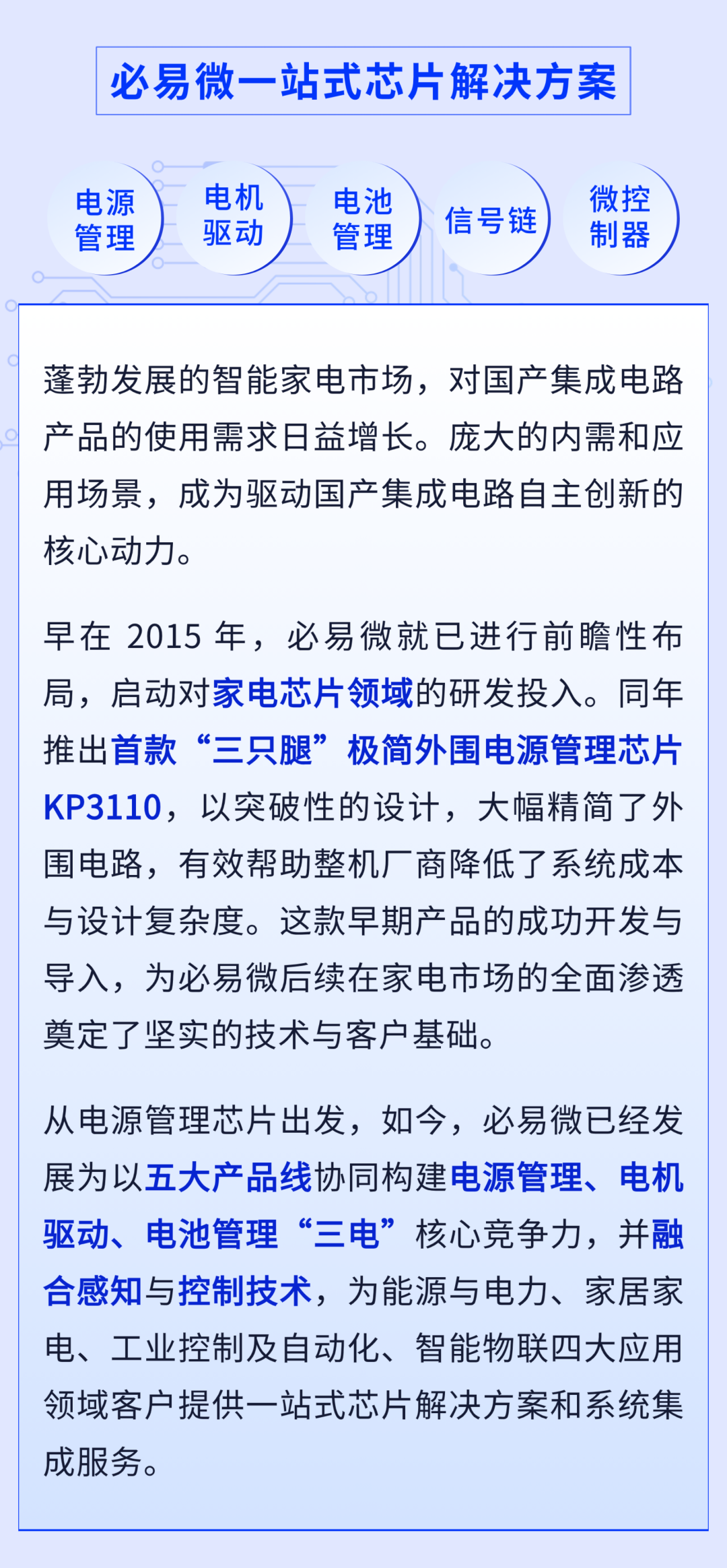 深圳市必易微电子股份有限公司(股票代码:688045)是一家高性能模拟及数模混合集成电路供应商,聚焦电源管理、电机驱动、电池管理等关键核心技术,为能源与电力、家居家电、工业控制及自动化、智能物联等领域客户提供一站式芯片解决方案和系统集成服务。