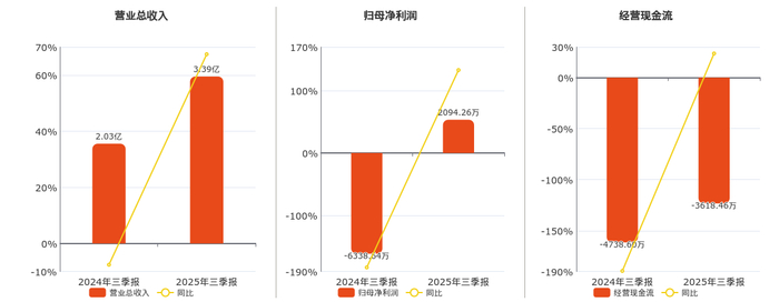 公司营业总收入为3.39亿元。归母净利润为2094.26万元。经营活动现金净流入为-3618.46万元。