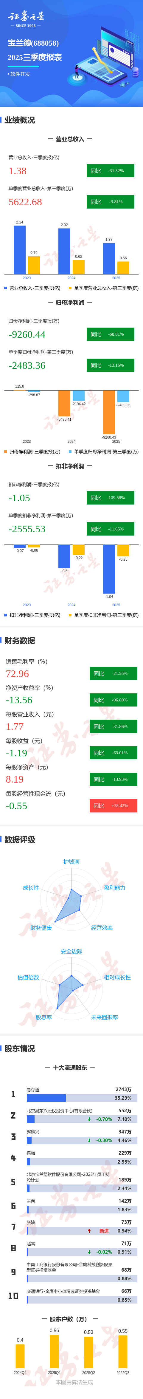 证券之星消息,宝兰德2025年三季报显示,前三季度公司主营收入1.38亿元,同比下降31.83%;归母净利润-9260.44万元,同比下降68.82%;扣非净利润-1.05亿元,同比下降109.59%;其中2025年第三季度,公司单季度主营收入5622.68万元,同比下降9.81%;单季度归母净利润-2483.36万元,同比下降13.17%;单季度扣非净利润-2555.53万元,同比下降11.66%;负债率7.55%,投资收益210.4万元,财务费用-63.59万元,毛利率72.96%。