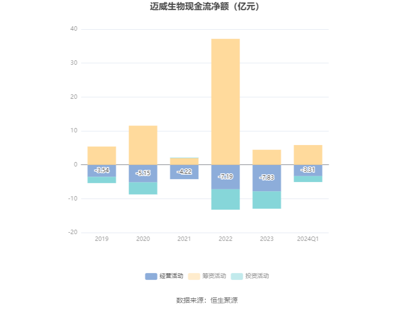 2024年第一季度,公司经营活动现金流净额为-3.31亿元,同比减少1.78亿元,主要系与江苏海博生物制药有限公司(曾用名:圣森生物制药有限公司)就9MW1111和8MW0511项目终止合作并支付合同解除款项所致;筹资活动现金流净额5.84亿元,同比增加4.14亿元;投资活动现金流净额-1.76亿元,上年同期为-2.55亿元。