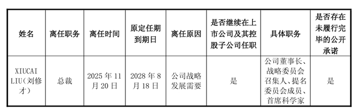 公告显示,刘修才辞去总裁职务后,仍继续担任董事长、董事会战略委员会召集人、董事会提名委员会成员以及公司首席科学家的职务。