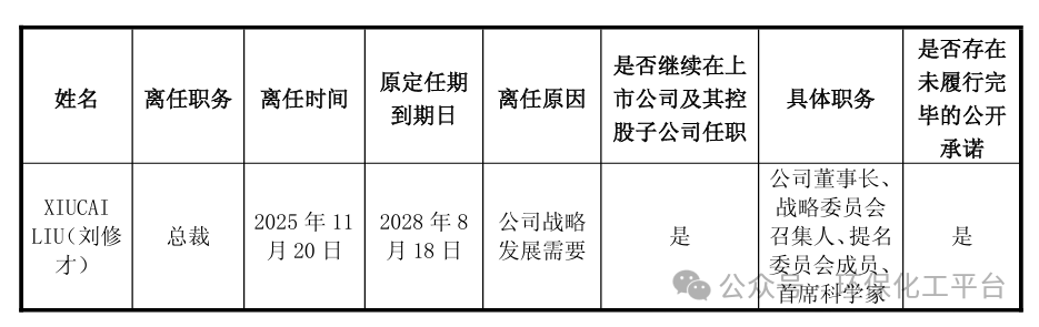 公告显示,刘修才辞去总裁职务后,仍继续担任董事长、董事会战略委员会召集人、董事会提名委员会成员以及公司首席科学家的职务。