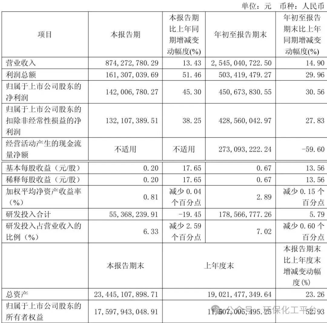 据悉,前三季度公司实现营业总收入25.45亿元,同比增长14.90%;归母净利润4.51亿元,同比增长30.56%;扣非净利润4.29亿元,同比增长27.83%。