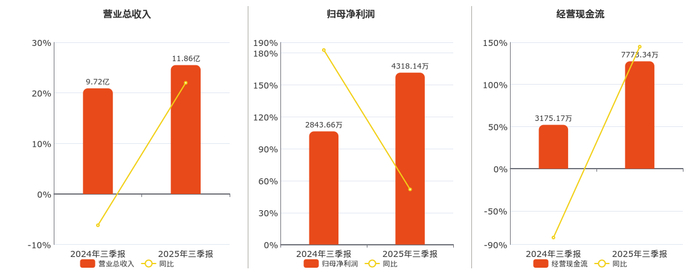 公司营业总收入为11.86亿元。归母净利润为4318.14万元。经营活动现金净流入为7773.34万元。
