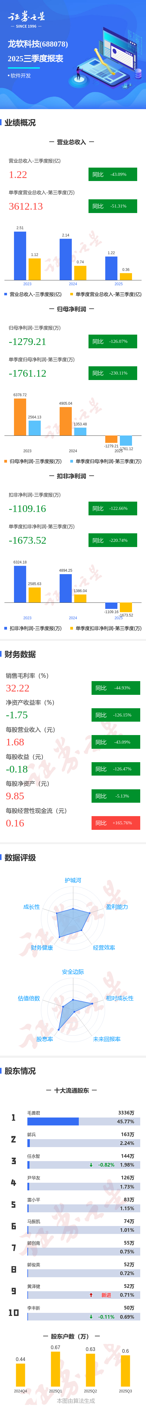证券之星消息,龙软科技2025年三季报显示,公司主营收入1.22亿元,同比下降43.1%;归母净利润-1279.21万元,同比下降126.08%;扣非净利润-1109.16万元,同比下降122.66%;其中2025年第三季度,公司单季度主营收入3612.13万元,同比下降51.32%;单季度归母净利润-1761.12万元,同比下降230.12%;单季度扣非净利润-1673.52万元,同比下降220.74%;负债率16.18%,投资收益-417.78万元,财务费用-19.48万元,毛利率32.22%。