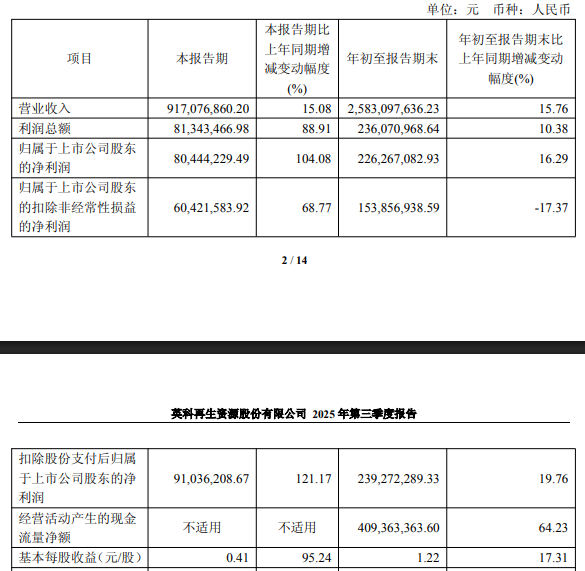 其中第三季度,英科再生营业收入为9.17亿元,同比增长15.08%;归母净利润为8044.42万元,同比增长104.08%;扣非归母净利润为6042.16万元,同比增长68.77%;基本每股收益0.41元。