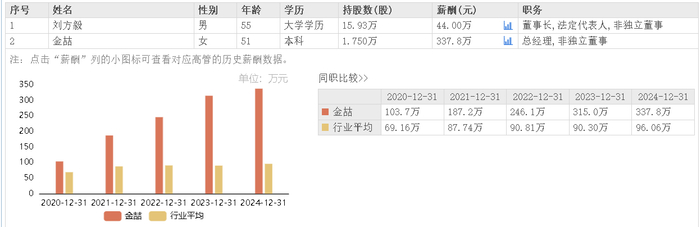 据东方财富网数据,英科再生总经理金喆2024年所获薪酬为337.8万元,是董事长刘方毅同年薪酬44万元的7.68倍。