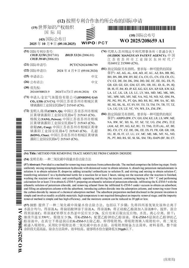 金宏气体公布国际专利申请:“一种二氧化碳中微量水份去除方法”