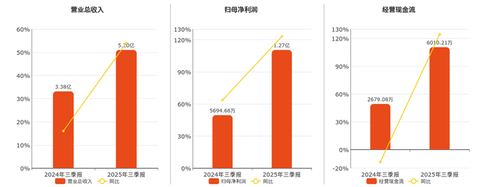 公司营业总收入为5.20亿元。归母净利润为1.27亿元。经营活动现金净流入为6010.21万元。