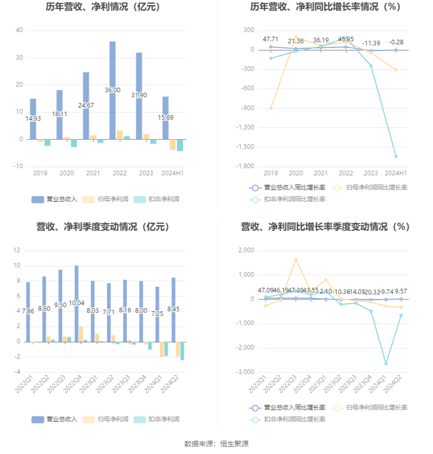 根据半年报,公司第二季度实现营业总收入8.45亿元,同比增长9.57%,环比增长16.53%;归母净利润-1.91亿元,同比下降331.03%,环比增长3.48%;扣非净利润-2.42亿元,同比下降660.11%,环比下降30.01%。