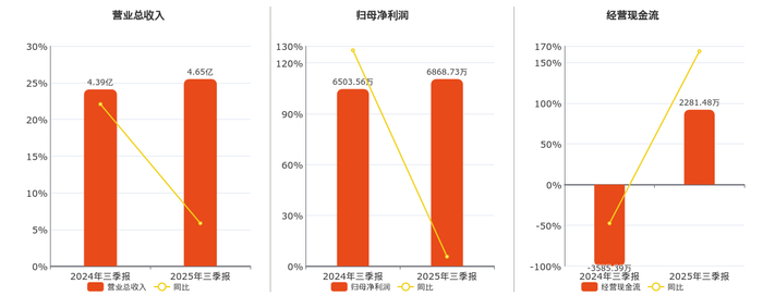 公司营业总收入为4.65亿元。归母净利润为6868.73万元。经营活动现金净流入为2281.48万元。