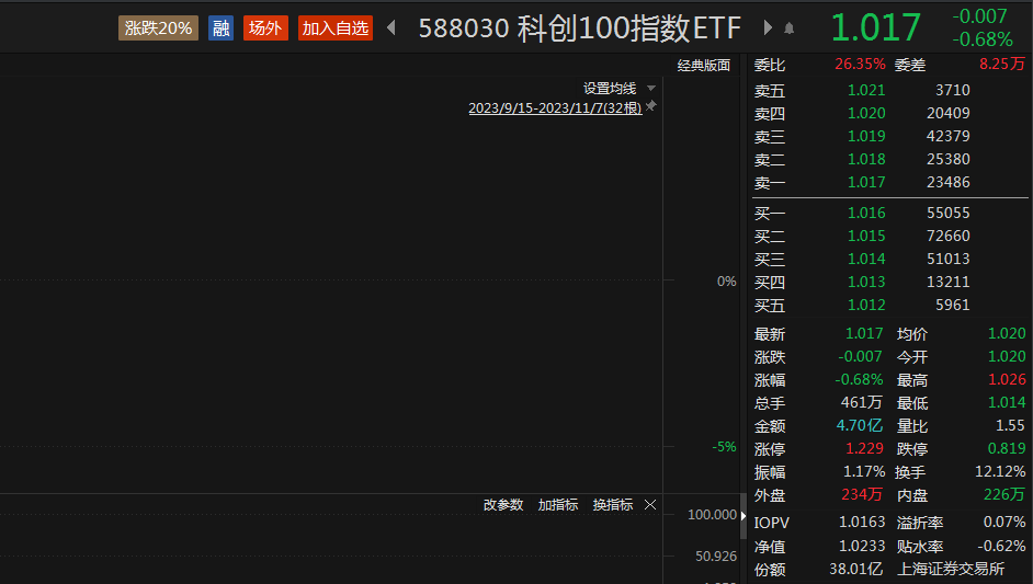 规模最大的跟踪科创100指数的ETF——科创100指数ETF(588030)午间收跌0.68%,盘中溢折率0.07%,成交额达4.7亿元,位列同标的产品第一。