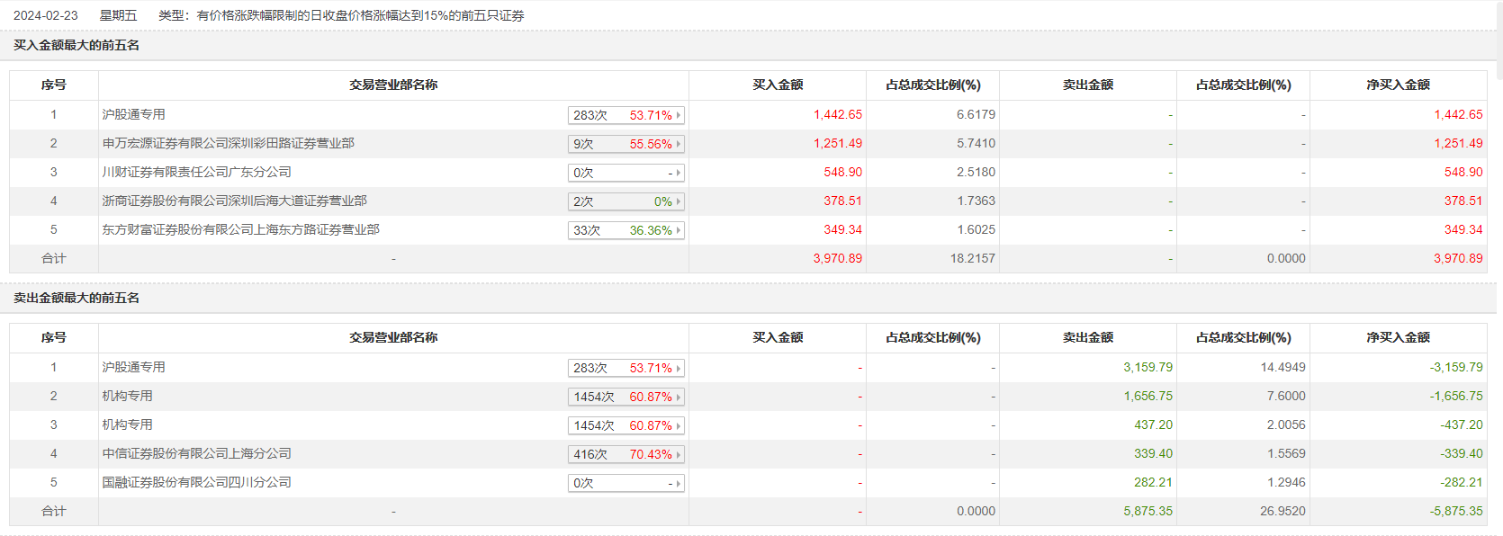 2月23日,步科股份今日涨16.76%,龙虎榜数据显示,上榜营业部席位全天成交9846.25万元,占当日总成交金额比例为45.17%。其中,买入金额为3970.9万元,卖出金额为5875.36万元,合计净卖出1904.46万元。