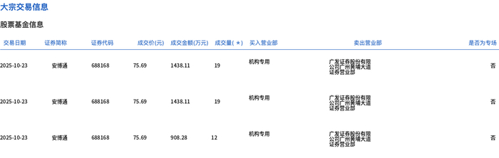 10月23日,安博通大宗交易成交50万股,成交额3784.5万元,占当日总成交额的35.37%,成交价75.69元,较市场收盘价76.84元折价1.5%。