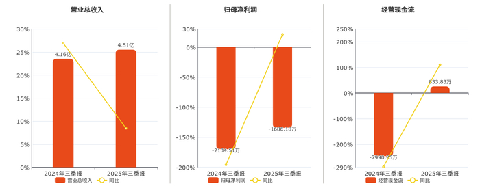 公司营业总收入为4.51亿元,在已披露的同业公司中排名第44。归母净利润为-1686.18万元,在已披露的同业公司中排名第61。经营活动现金净流入为833.83万元,在已披露的同业公司中排名第46。