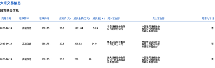 10月13日,高凌信息大宗交易成交81.2万股,成交额1688.96万元,占当日总成交额的19.36%,成交价20.8元,较市场收盘价24.77元折价16.03%。
