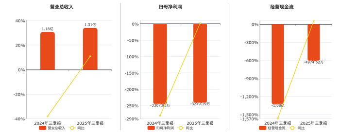 公司营业总收入为1.31亿元。归母净利润为-3249.19万元。经营活动现金净流入为-4974.62万元。