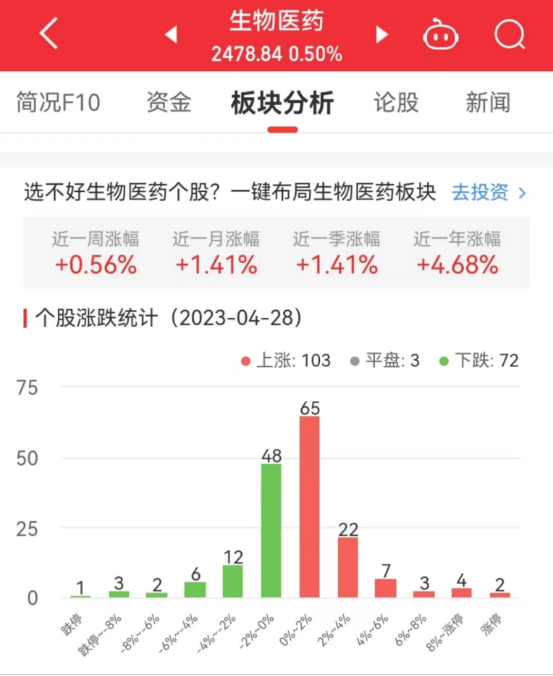 中国经济网北京4月28日讯今日,生物医药板块整体涨幅0.50%,其中103只股票上涨,3只股票平盘,72只股票下跌。