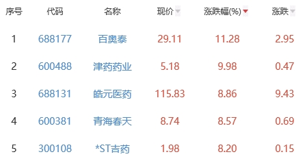 其中,百奥泰、津药药业、皓元医药、青海春天、*ST吉药位列板块涨幅前五位,涨幅分别为11.28%、9.98%、8.86%、8.57%、8.20%。