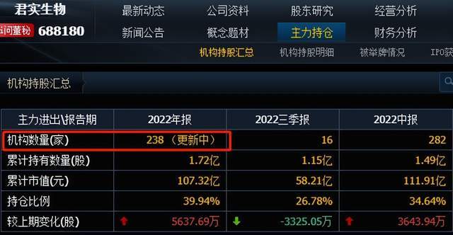 4月17日收盘,君实生物报价53.19元,相比上市首日的220元历史高价,跌去75%。同花顺显示,君实生物有3.73万户股东,其中机构数量超过230家,持仓比例在40%左右。君实生物股价下跌,股东们很受伤。